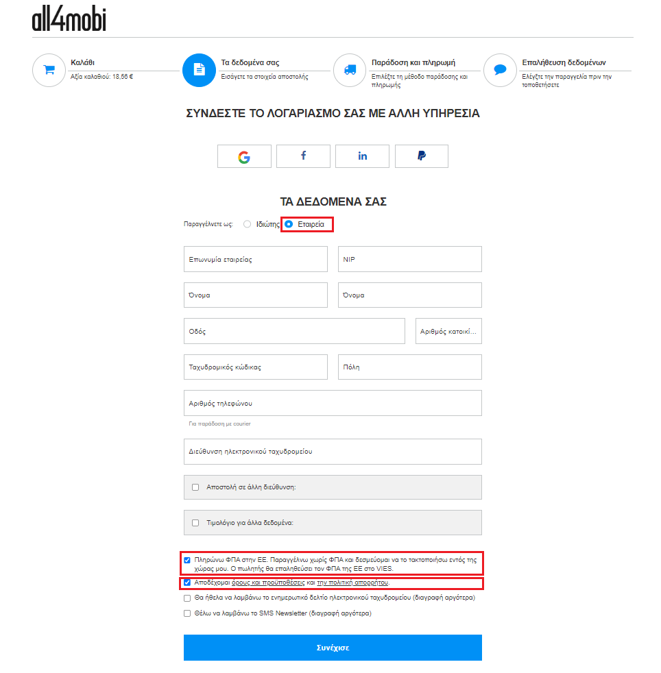 Το ηλεκτρονικό κατάστημα All4mobi S.A. λειτουργεί από πολωνική εταιρεία με έδρα τη Βαρσοβία. Εάν είστε υπόχρεος καταβολής ΦΠΑ σε άλλη χώρα εκτός της Πολωνίας, είναι απαραίτητο η αγορά σας να μειωθεί κατά το ποσό του ΦΠΑ. Το μόνο που χρειάζεται να κάνετε κατά την εισαγωγή των στοιχείων σας είναι να διαβάσετε και να εγκρίνετε τους όρους και τις προϋποθέσεις και την πολιτική απορρήτου και να τσεκάρετε τα ακόλουθα κουτάκια: