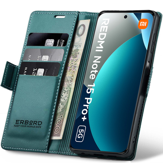 • 1 × Θήκη πορτοφολιού με πτυσσόμενο κάλυμμα ERBORD Glossy Litchi για Xiaomi Redmi Note 15 Pro Plus 5G / Poco M8 Pro 5G - πράσινο