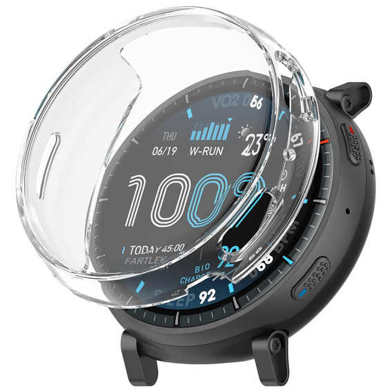 Το λεπτό προφίλ του καλύμματος δεν προσθέτ ει αισθητά πάχος στο ρολόι, οπότε το Amazfit Active Max εξακολουθεί να εφαρμόζει άνετα στον καρπό σας στη δουλειά, στο σπίτι ή κατά τη διάρκεια της σωματικής άσκησης. Η ελαφριά κατασκευή δεν βαραίνει το χέρι, ενώ το λείο φινίρισμα TPU ταιριάζει καλά τόσο με αθλητικά λουράκια όσο και με κομψά βραχιόλια. Το φινίρισμα προσδίδει στο smartwatch έναν καθολικό, διαχρονικό χαρακτήρα – ταιριάζει με κάθε στυλ και χρώμα λουριού.